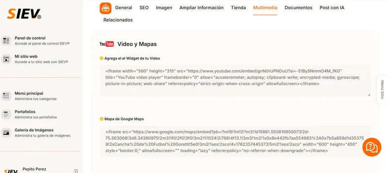 La sección Multimedia te permite enriquecer tus portafolios agregando videos o mapas interactivos mediante códigos Iframe. Puedes insertar videos desde plataformas como YouTube o Vimeo para mostrar contenido visual, o integrar mapas desde Google Maps o Waze para indicar ubicaciones.