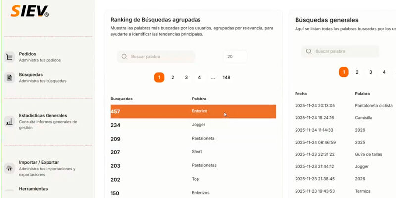 En este módulo puedes analizar el comportamiento de búsqueda de los usuarios dentro de tu sitio web. El sistema registra cada palabra o frase que los visitantes escriben en el buscador y las clasifica según su frecuencia y resultado, lo que te permite identificar intereses, tendencias y posibles oportunidades de mejora en tu catálogo o contenido.