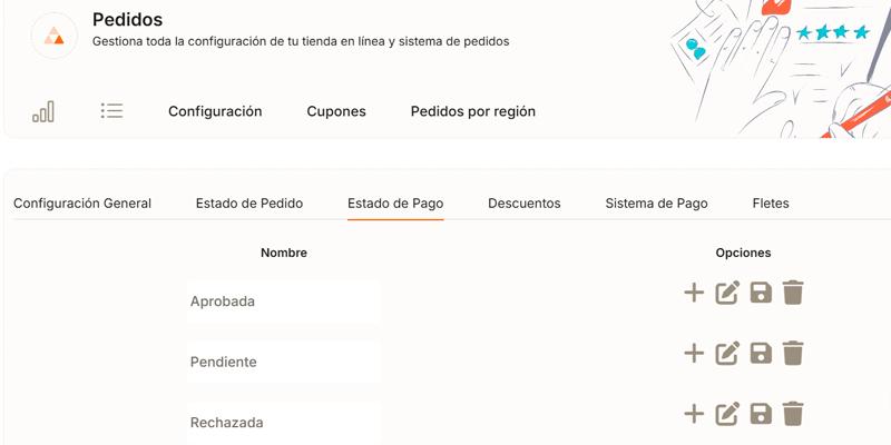 Este apartado te permite configurar y personalizar los estados de pago según el proceso de validación de cada transacción. Definir estados como pendiente, aprobado, rechazado o reembolsado te ayudará a llevar un control claro y ordenado de los pagos dentro de tu tienda en línea.